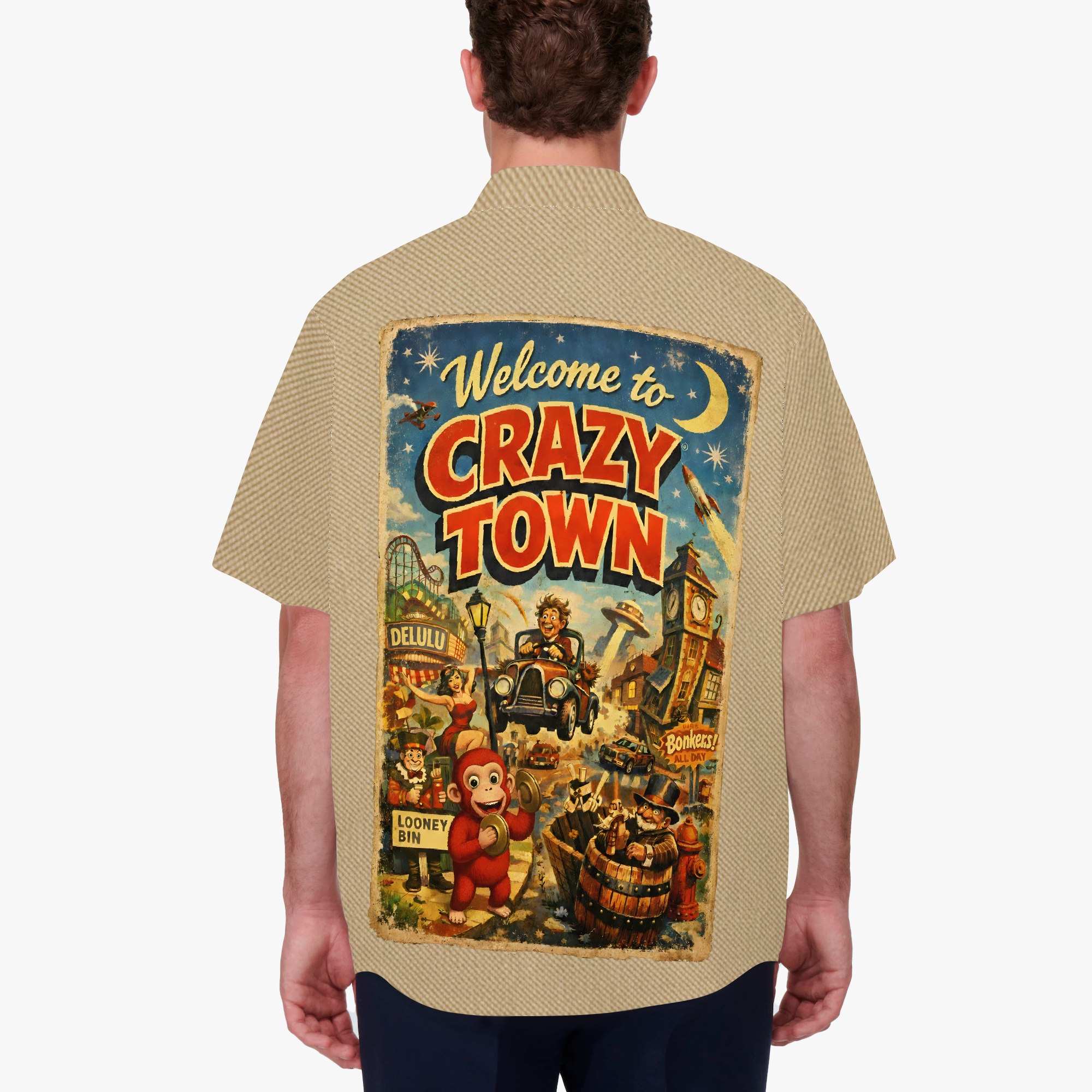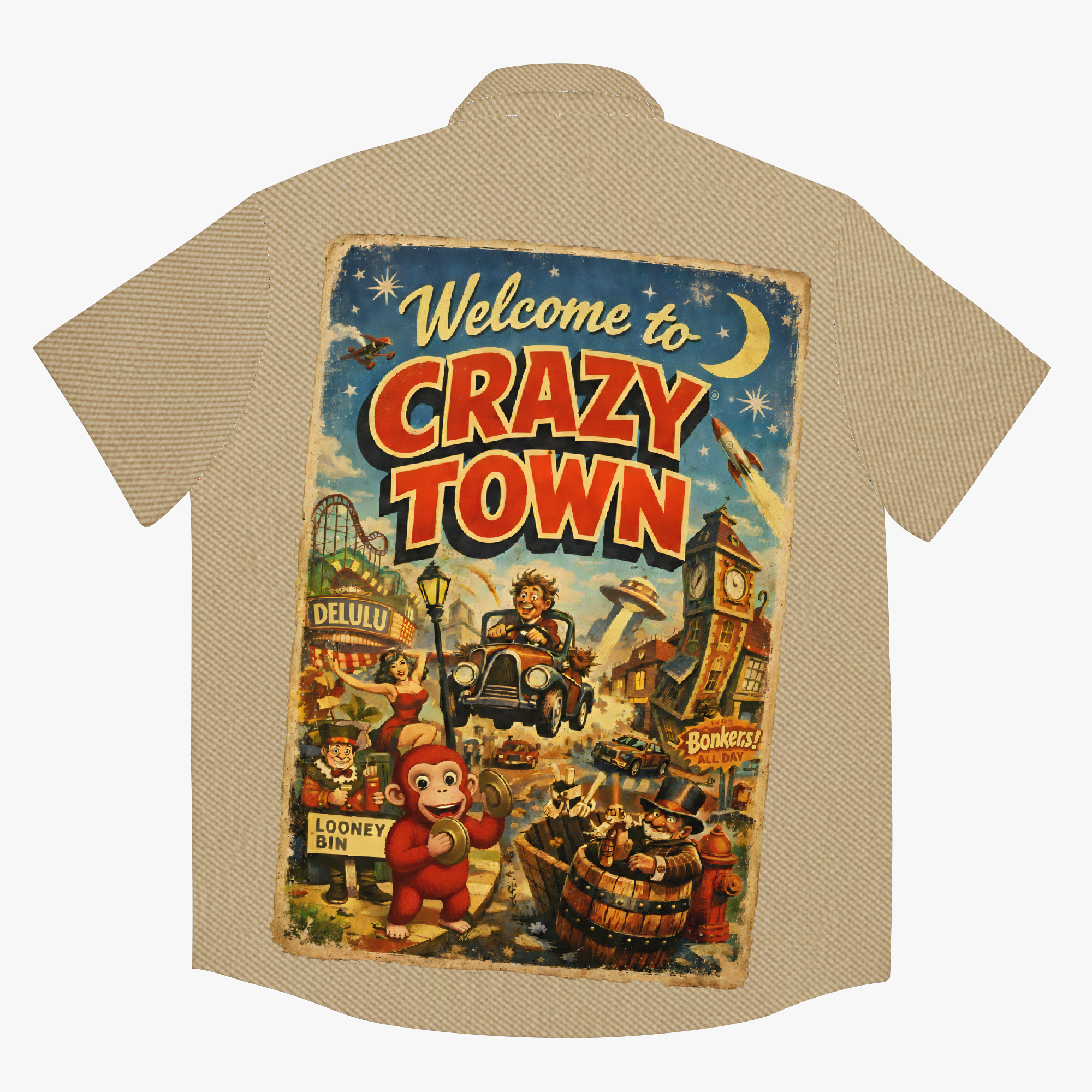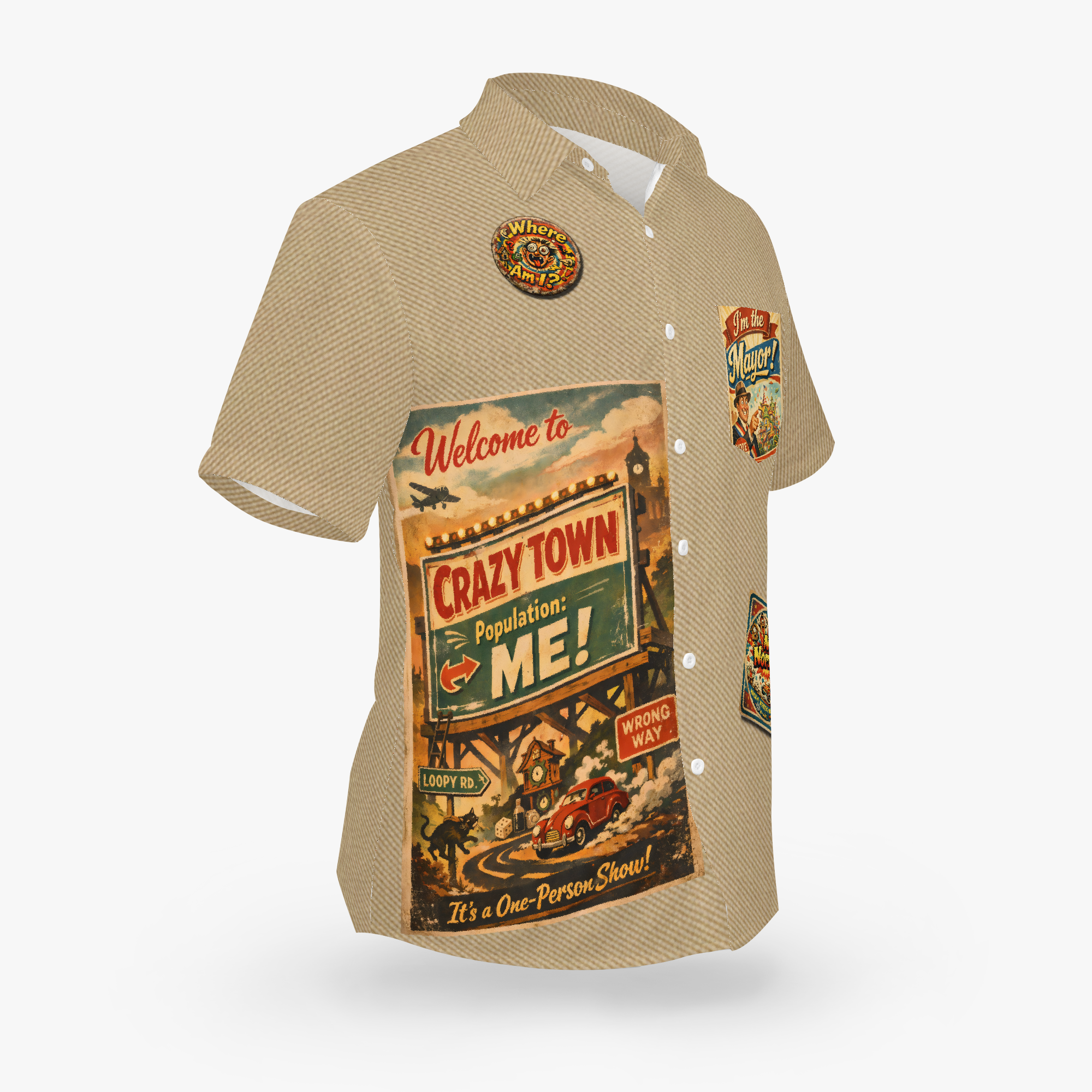 Welcome to Crazy Town: where the vibes are vintage, the flair is unfiltered, and the population is proudly unstable. This retro-inspired shirt design channels the golden age of travel posters with a wink and a wild twist: cuckoo clocks, wrong-way signs, and dicey detours all point to one undeniable truth… it’s a one-person show, and you’re the star.