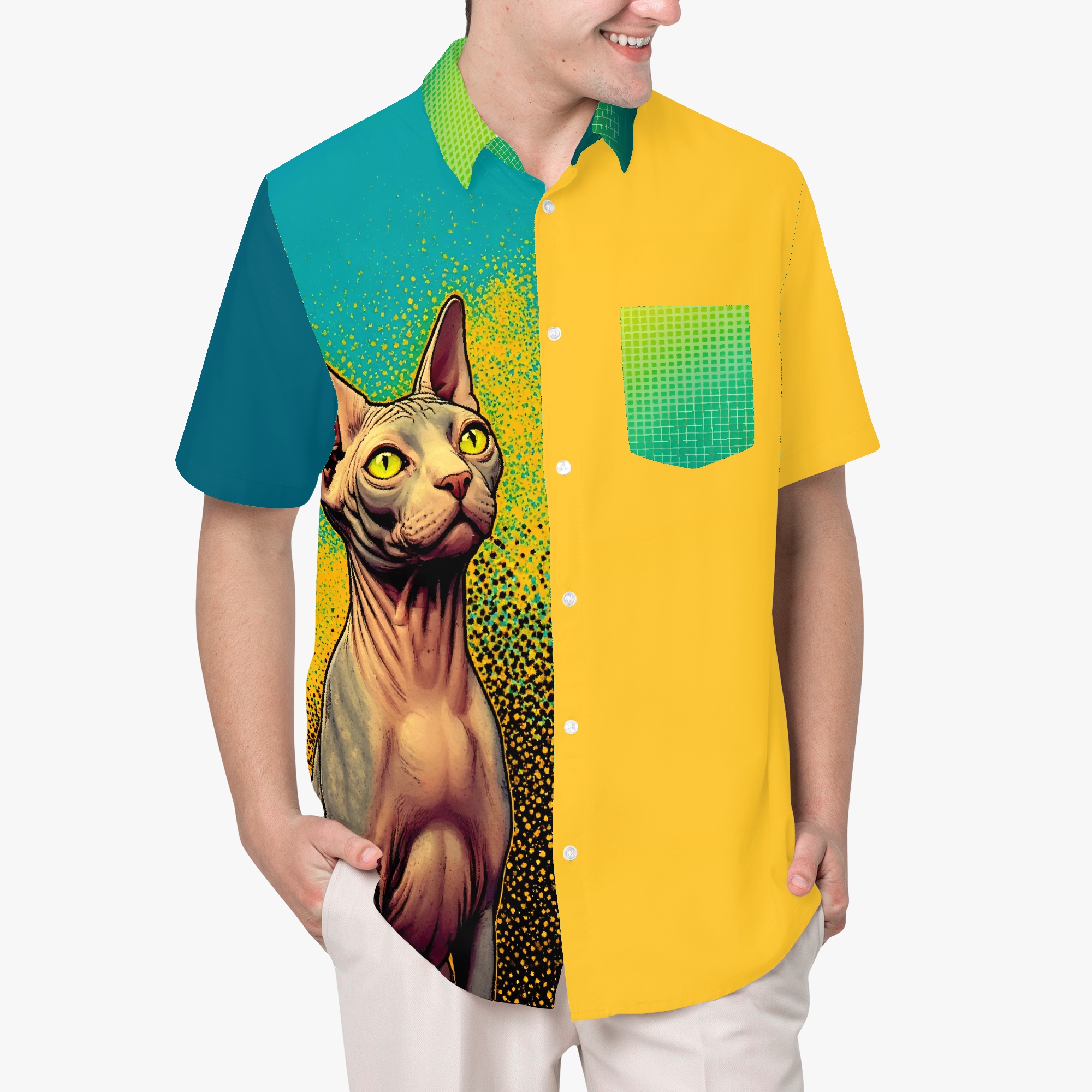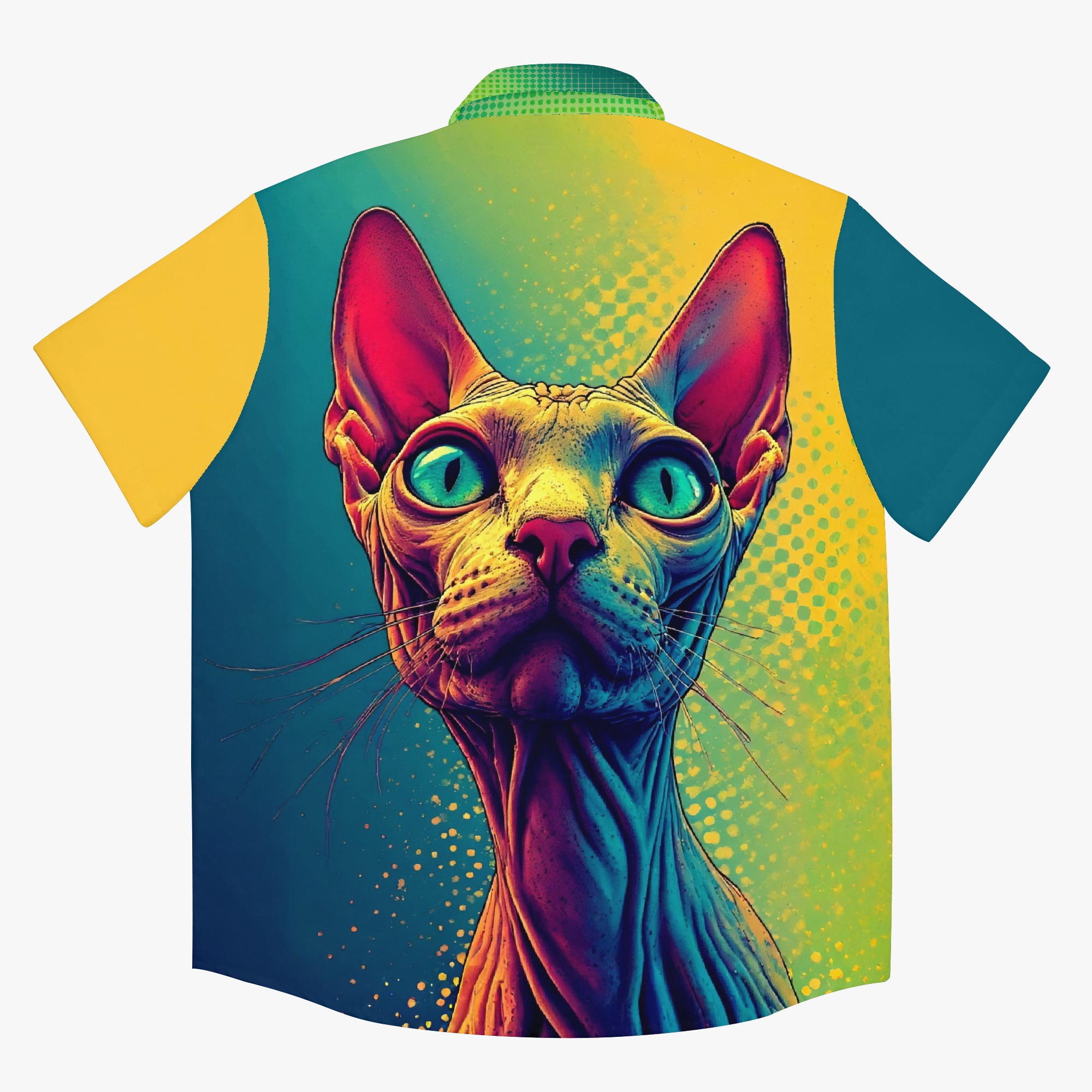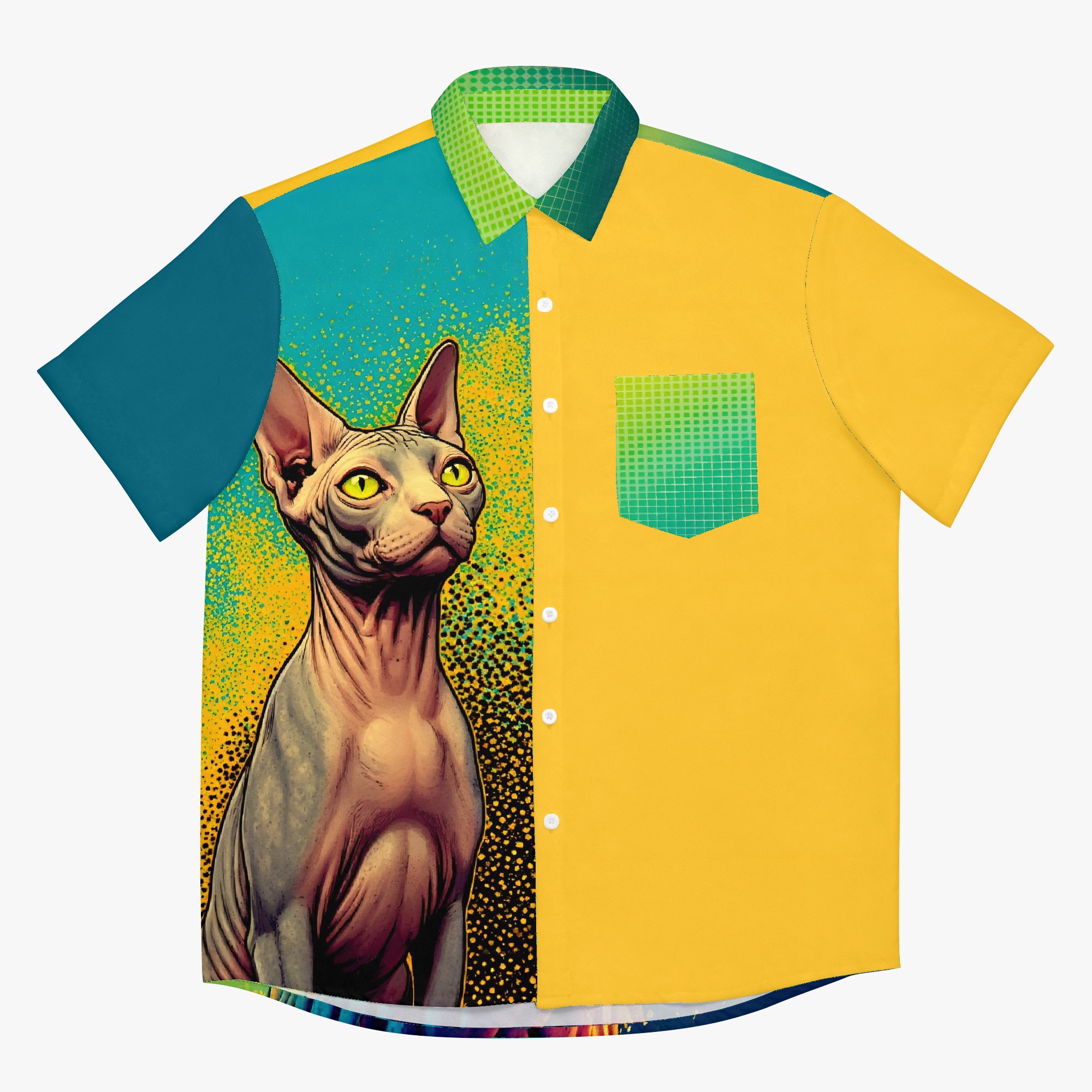 Halftone Highness is a bold design featuring a sphynx cat in classic halftone style… sharp, graphic, unique colors, and totally regal. With its big eyes and bare skin, it rules the canvas like a punk pharaoh from a retro comic book. Frankly, these color combinations are not going to appeal to everyone… but Sphynx cats don’t appeal to everyone either. I say, “Long live the bald!”