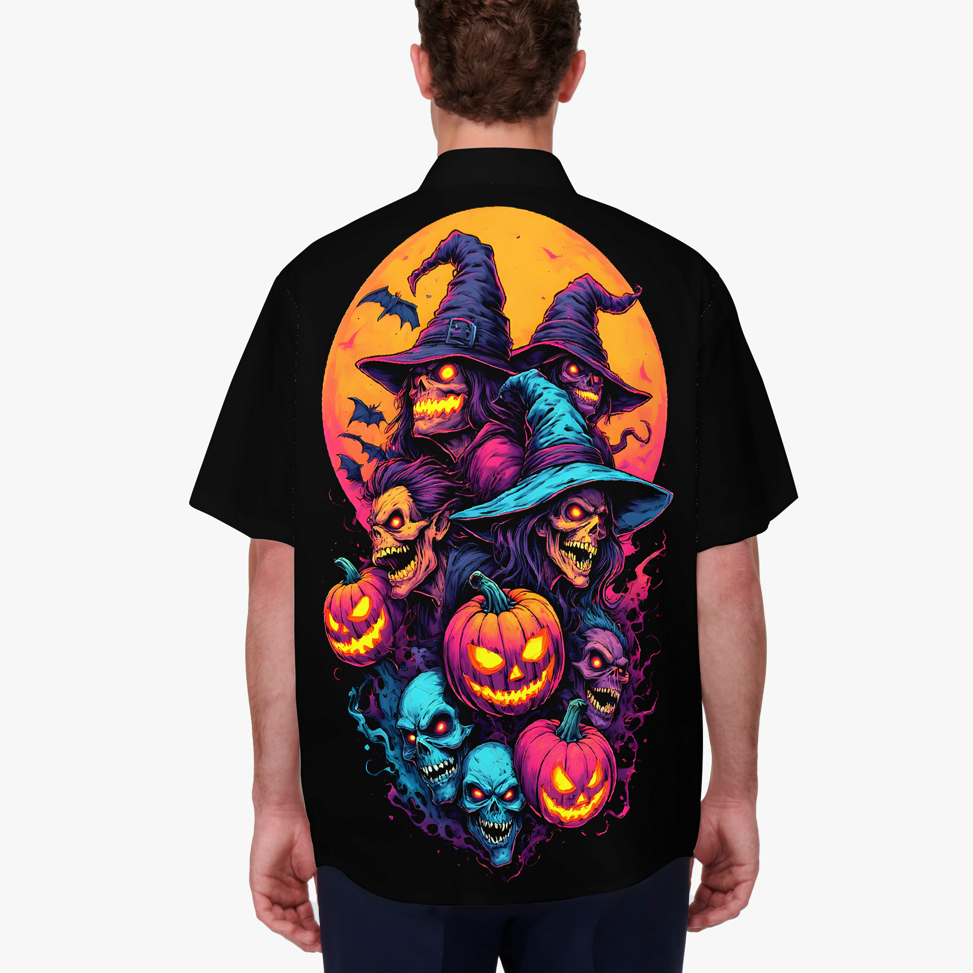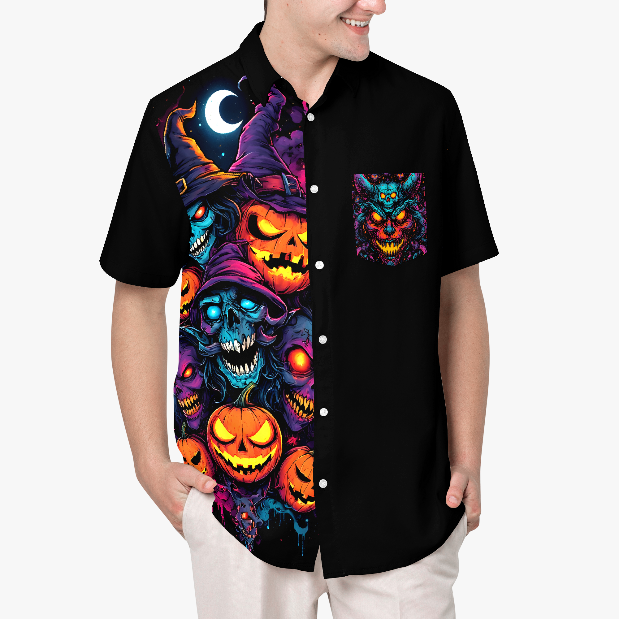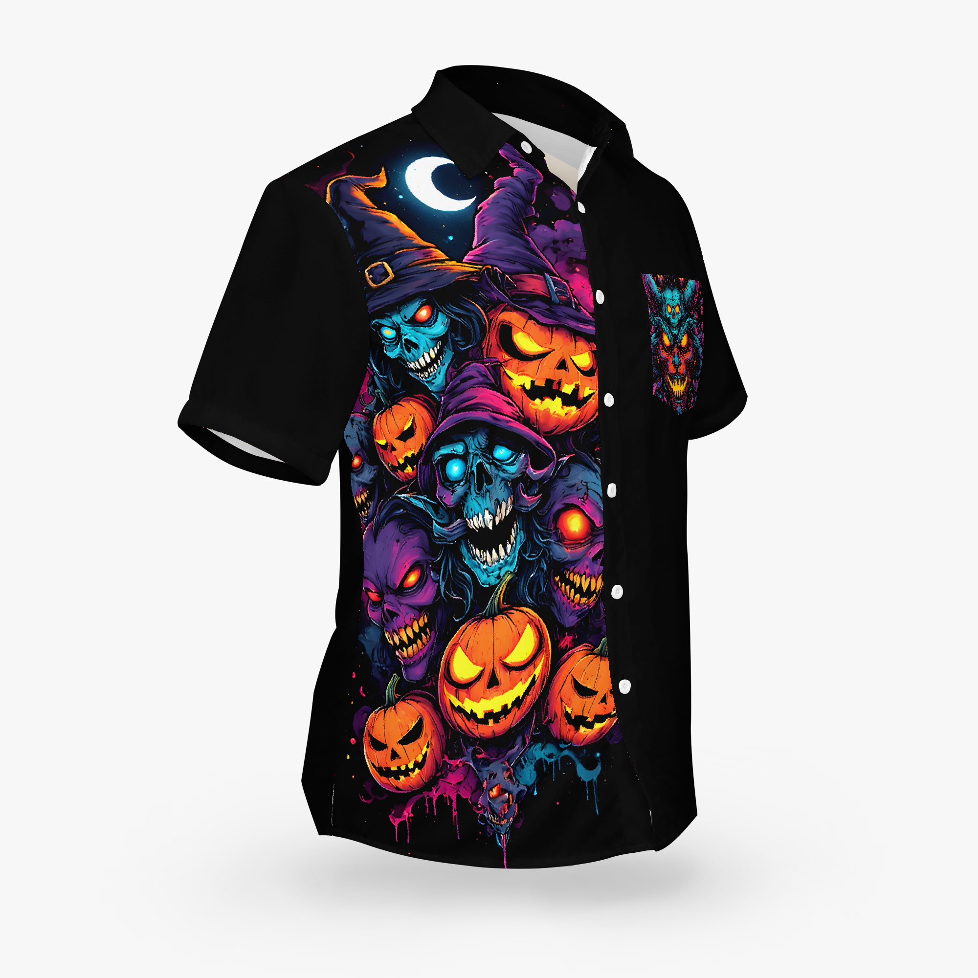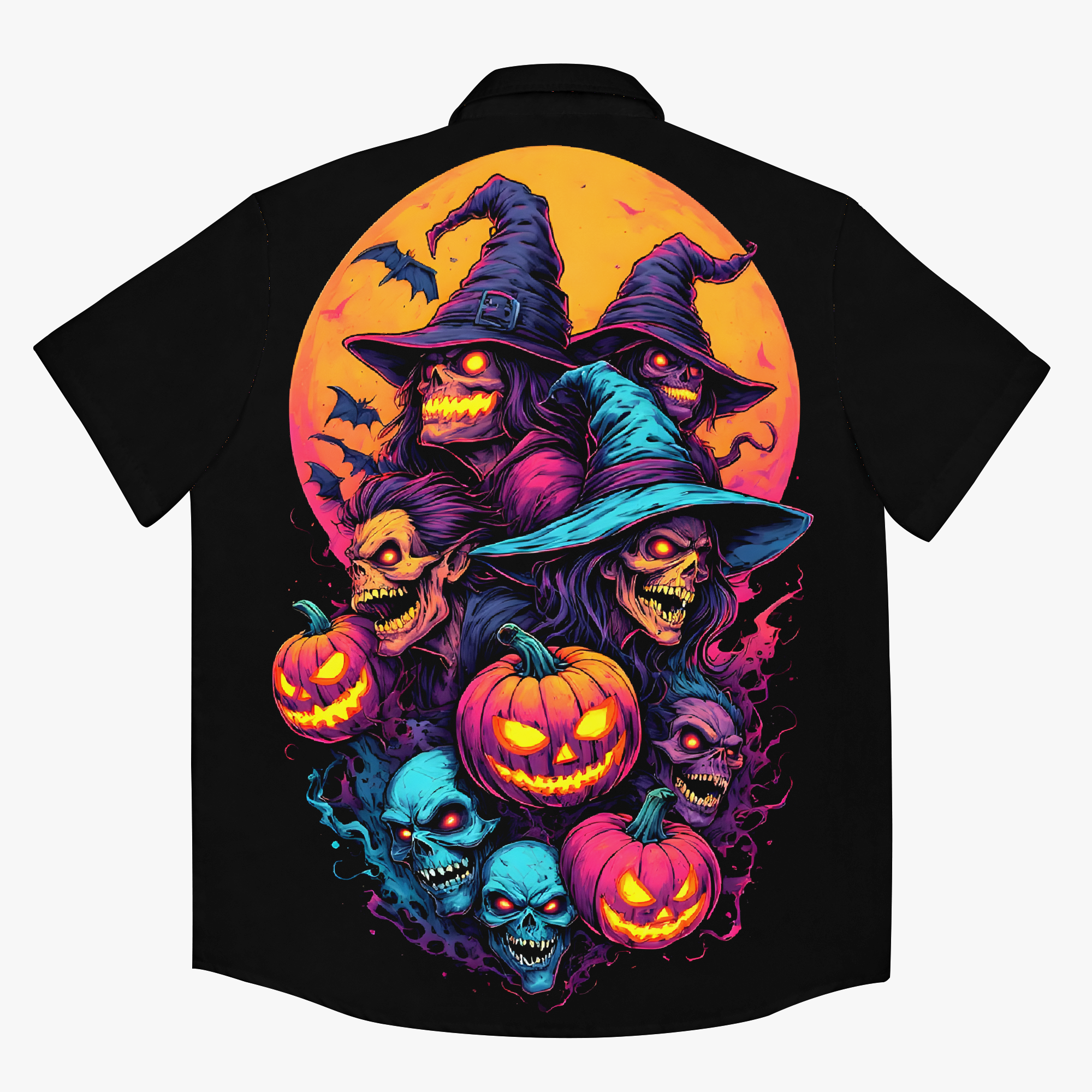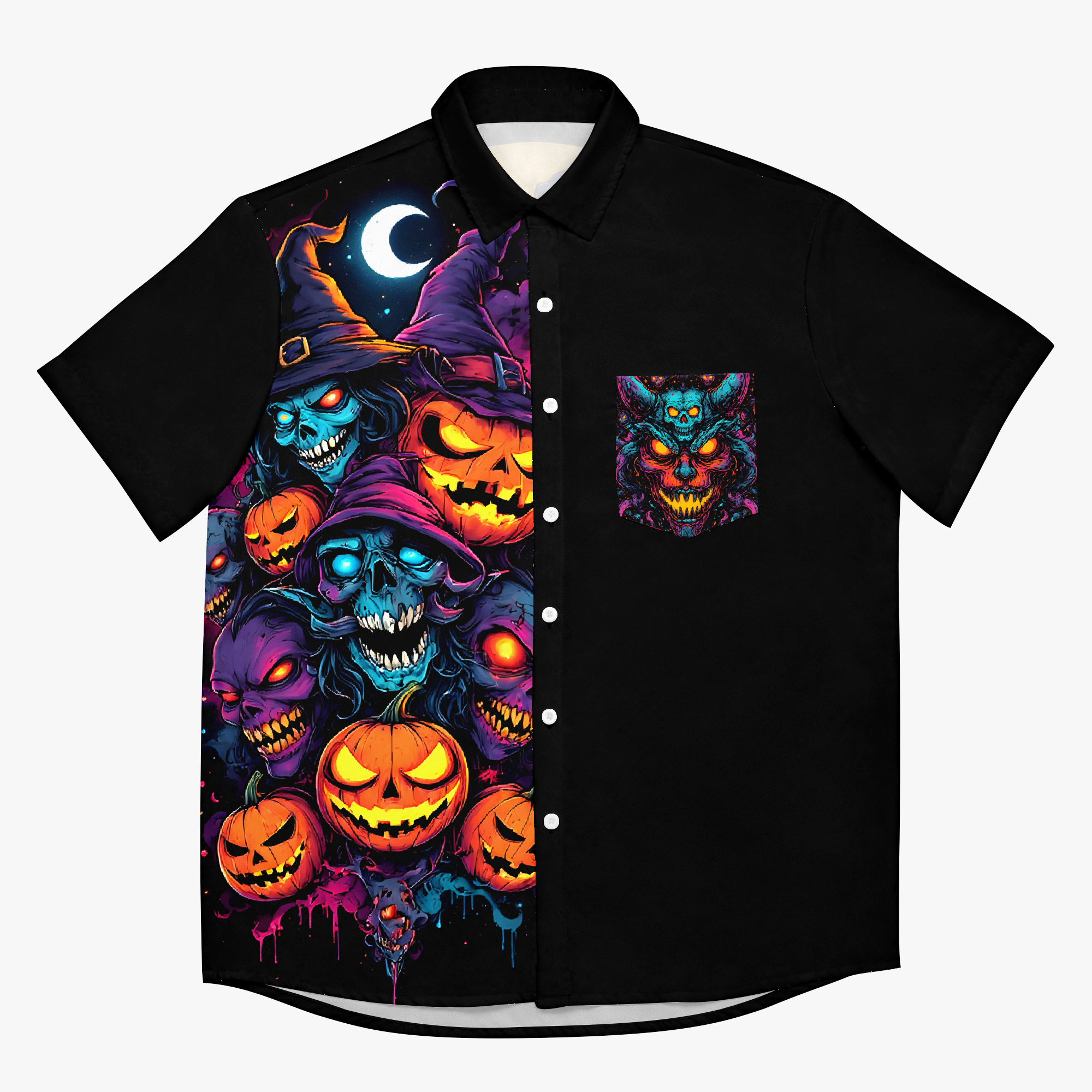 Hexcellent is where wicked meets wonderful. This electrifying design conjures a coven of grinning ghouls and spectral pumpkins, bathed in dread and mischief. Each snarl and stare is a spell cast in color… equal parts horror and hype. Whether you’re haunting the streets or hexing the mundane, this is a badge of stylish sorcery.