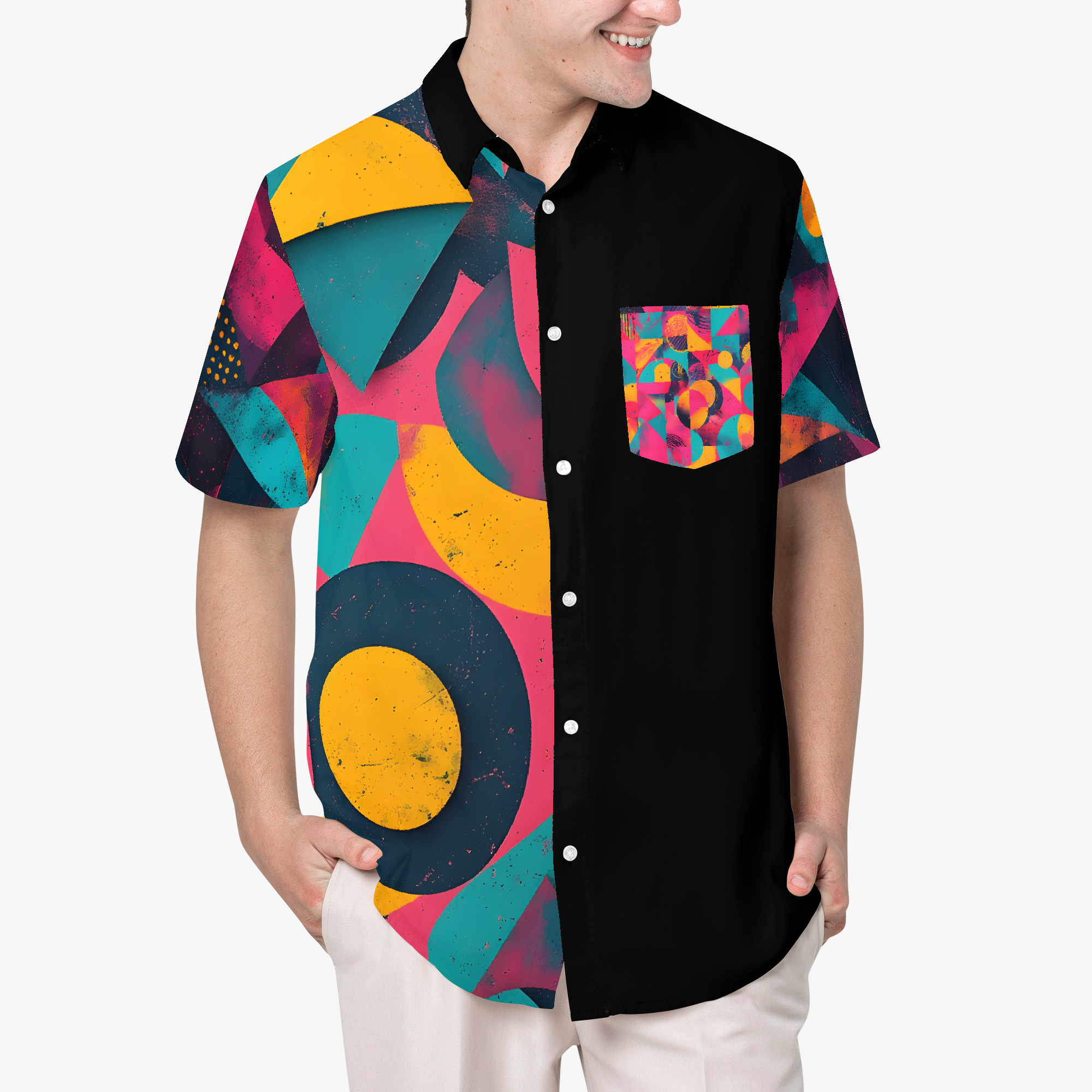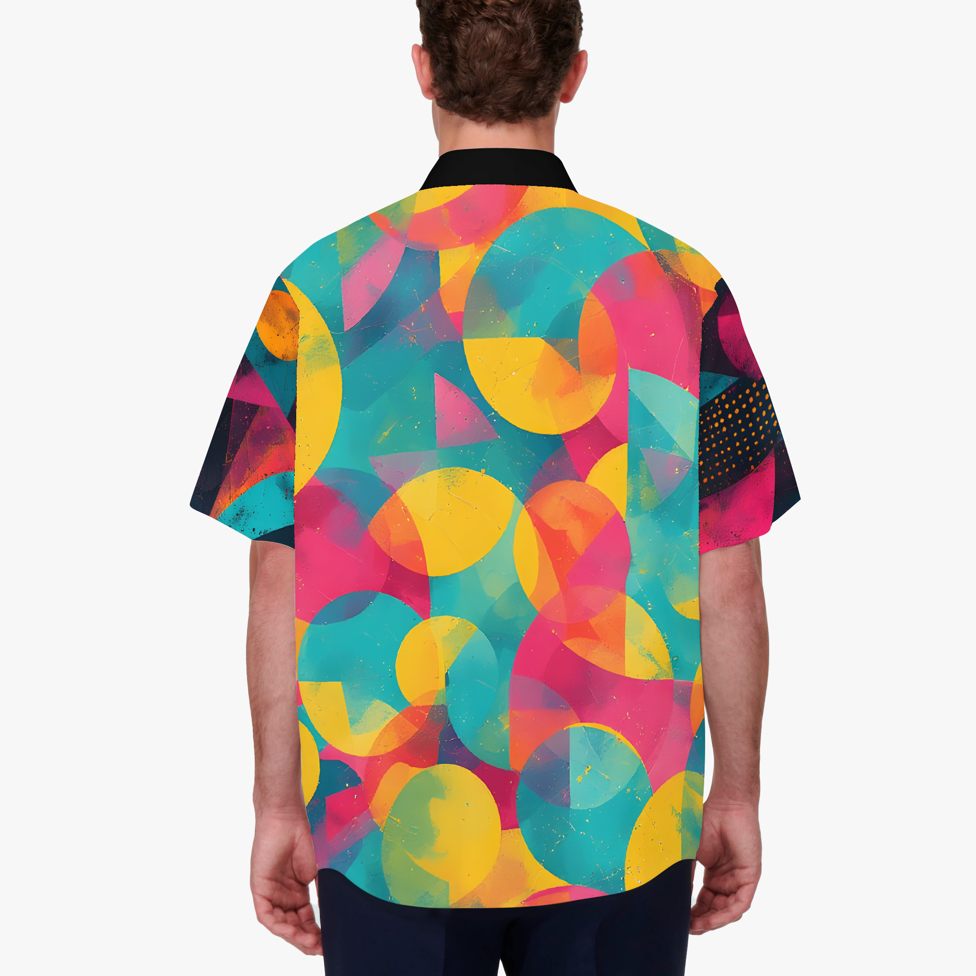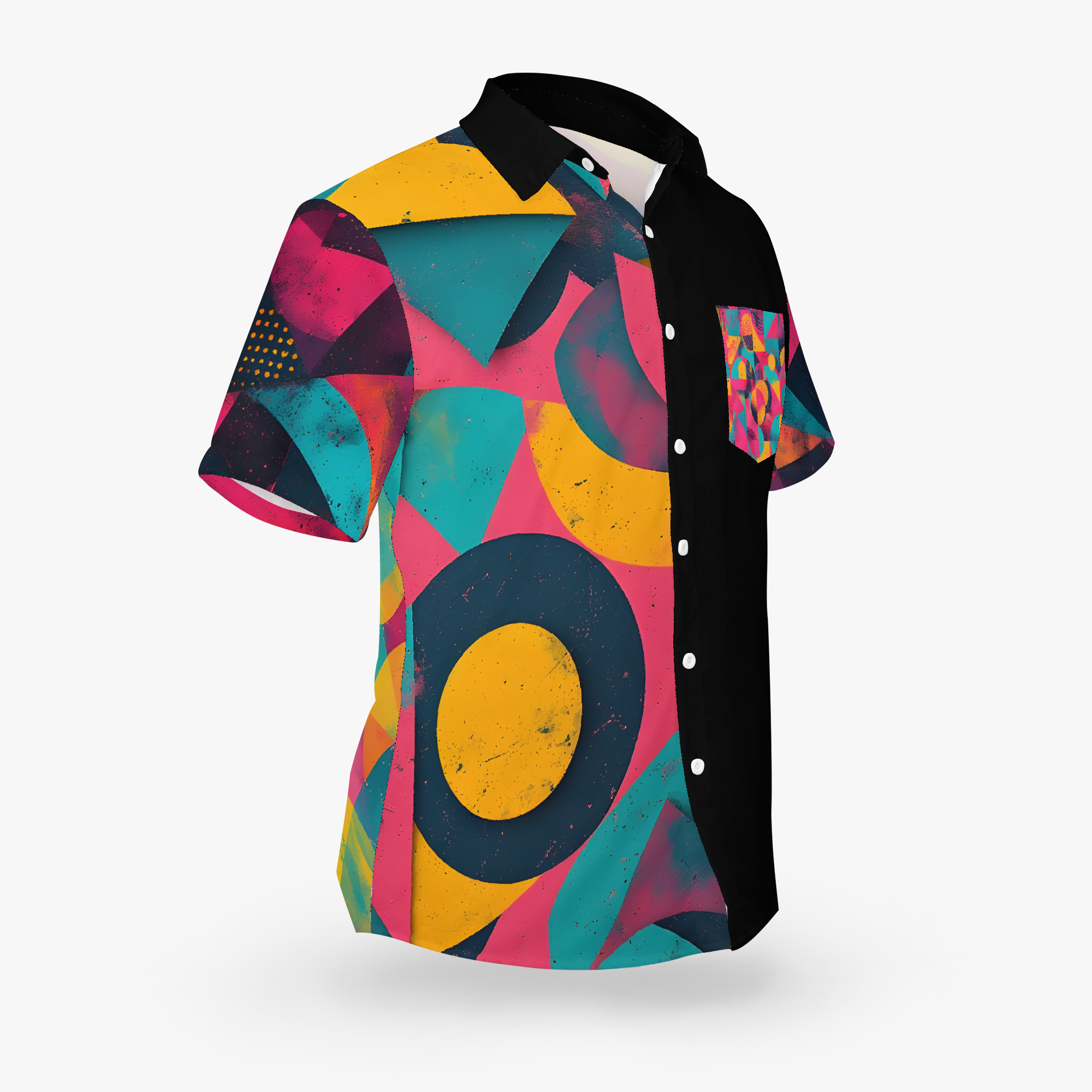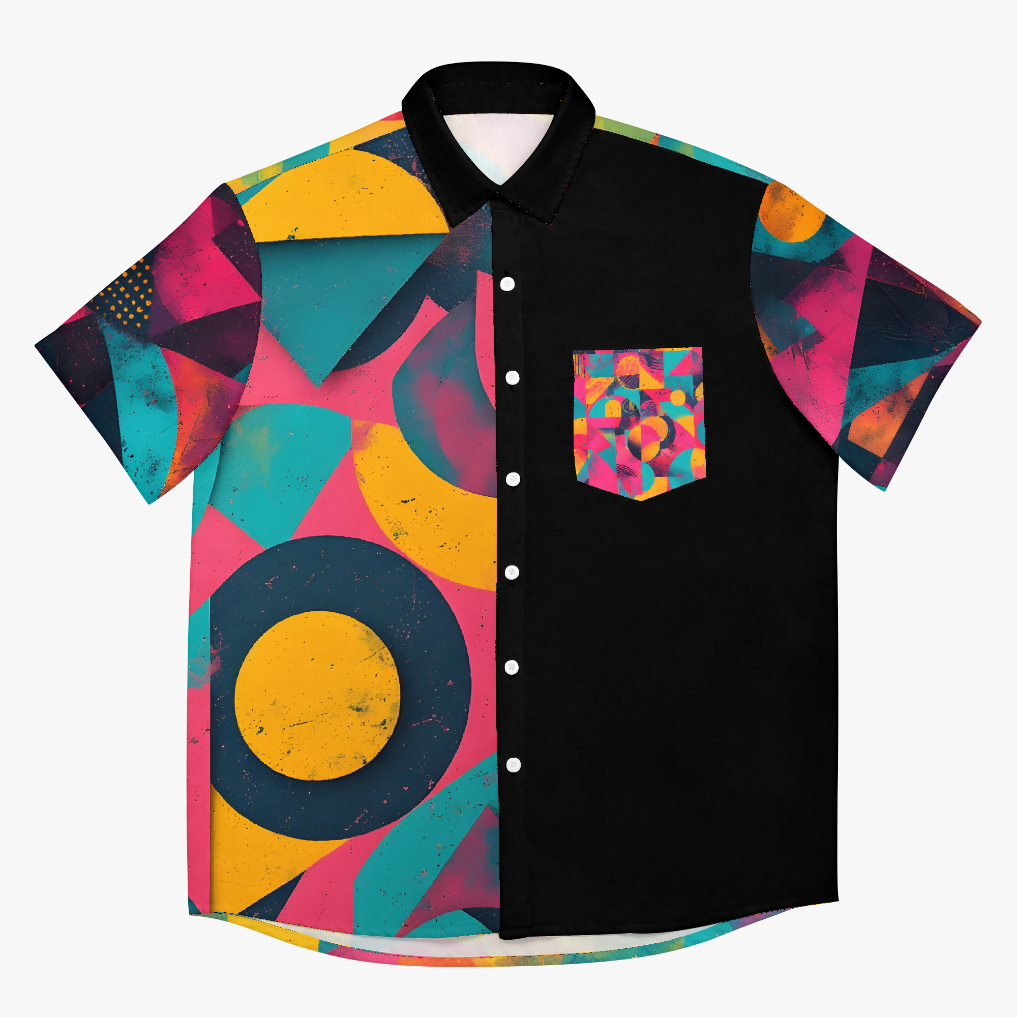 Memphis Mayhem brings the joyful chaos of retro geometry to life. Neon pink, electric teal, and canary yellow collide in a whirlwind of shapes that feel both rebellious and perfectly intentional. It’s a wearable burst of 80s-inspired energy with bold murals and sleek contrast, designed for anyone who loves their style loud, playful, and impossible to ignore.