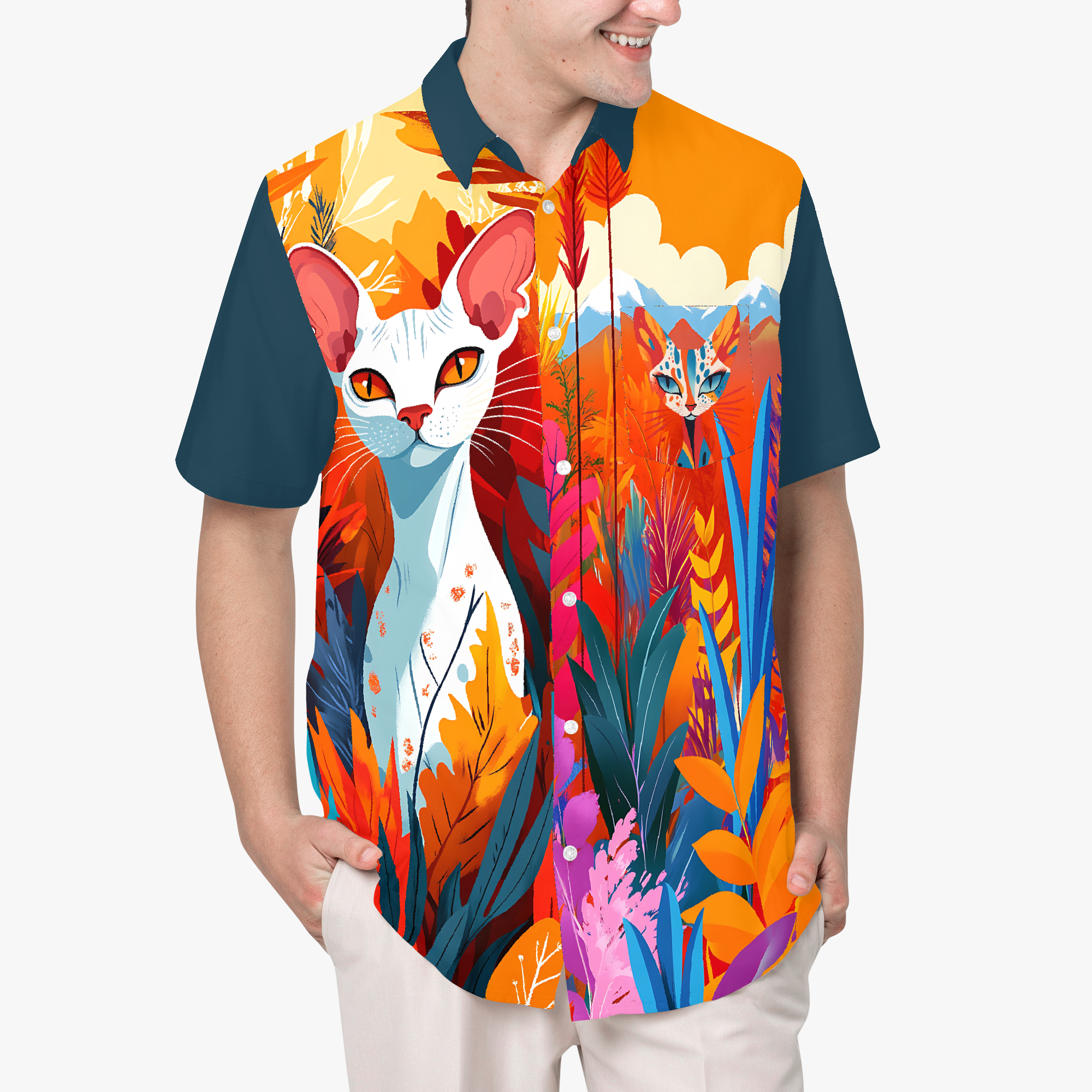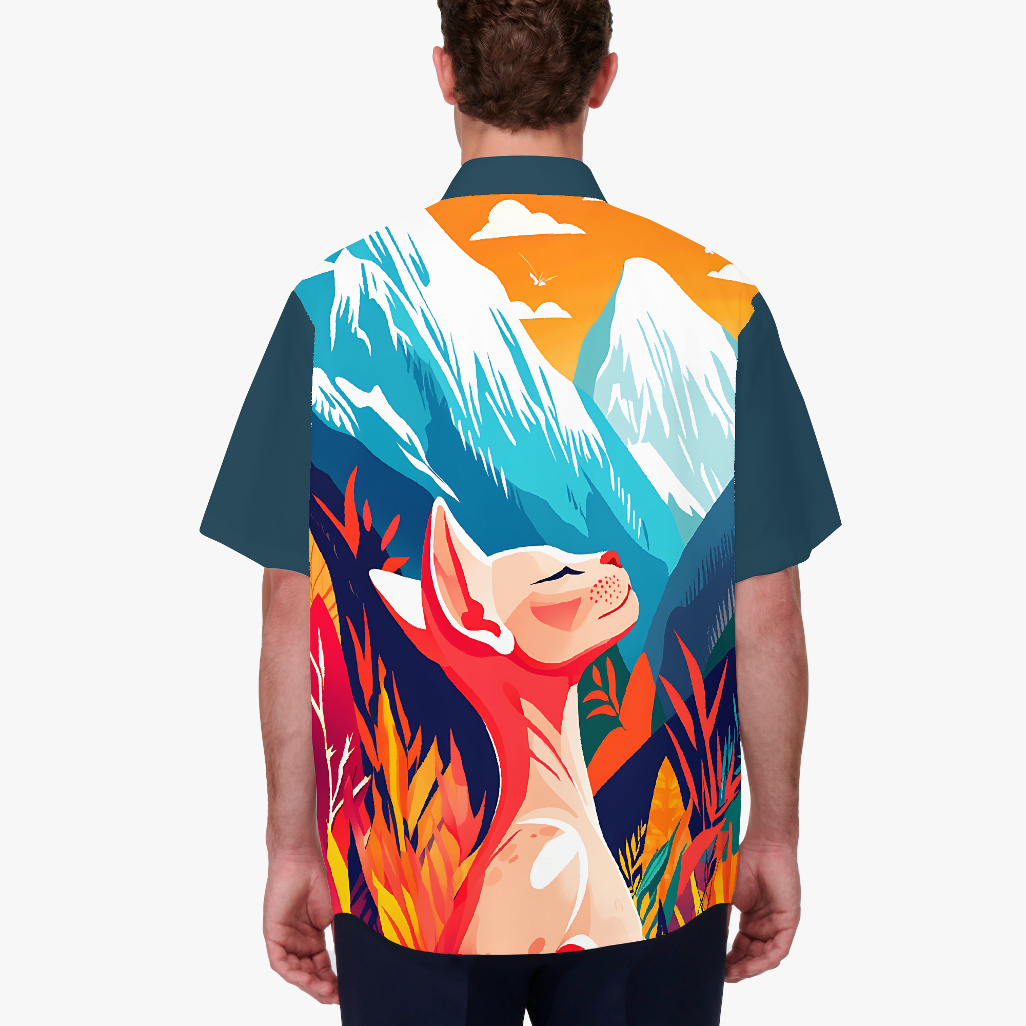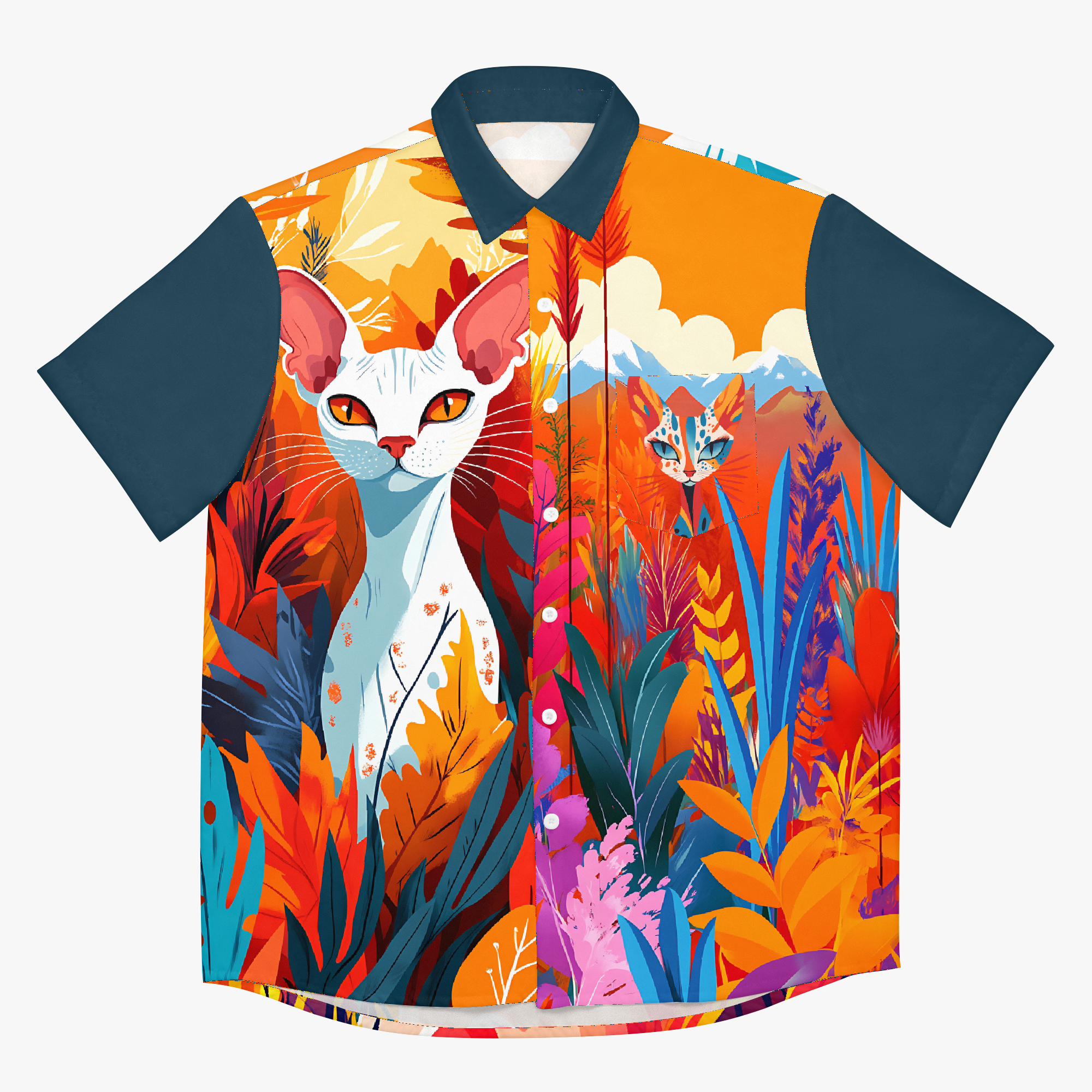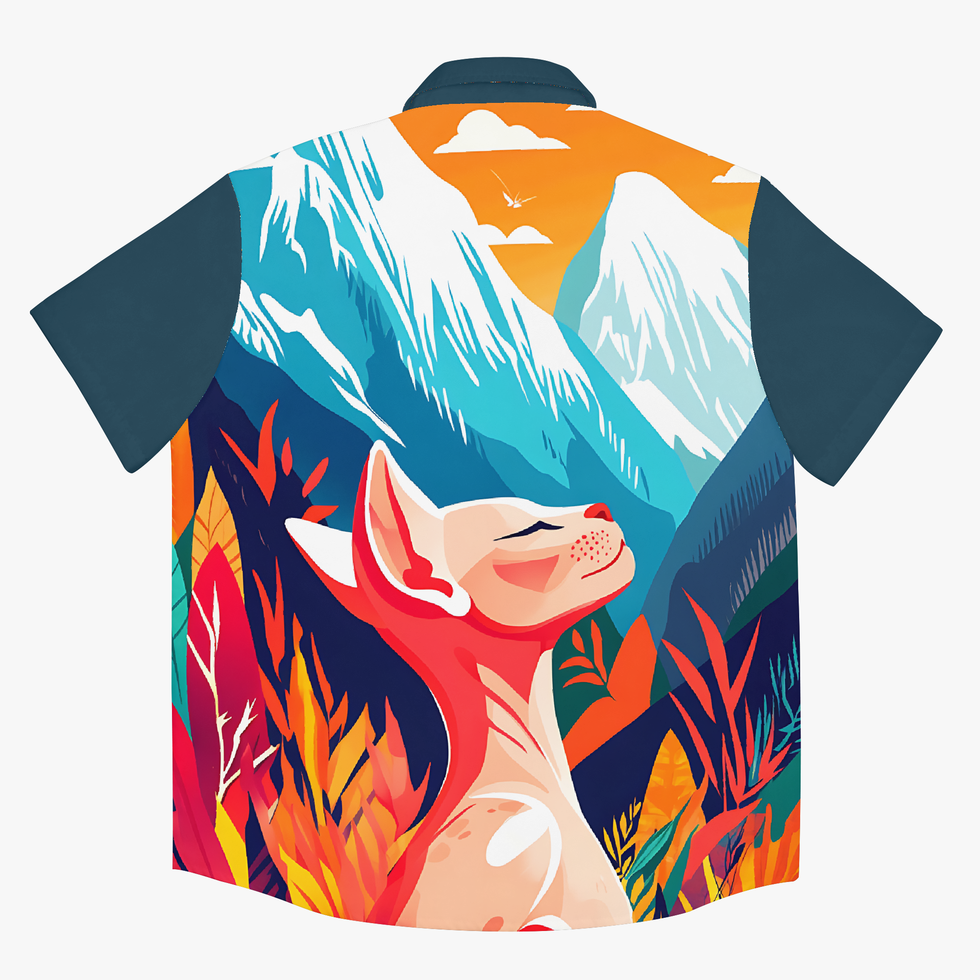 Tangerine Skies blends surreal landscapes, bold botanicals, and quiet creatures into a design of vivid escapes. Saturated with emotion and imagination, the design invites you to wander through wonder… where the sun glows orange, the plants whisper secrets, and the wild watches back. Wear it when you want to stand out, slow down, or simply drift somewhere beautiful.