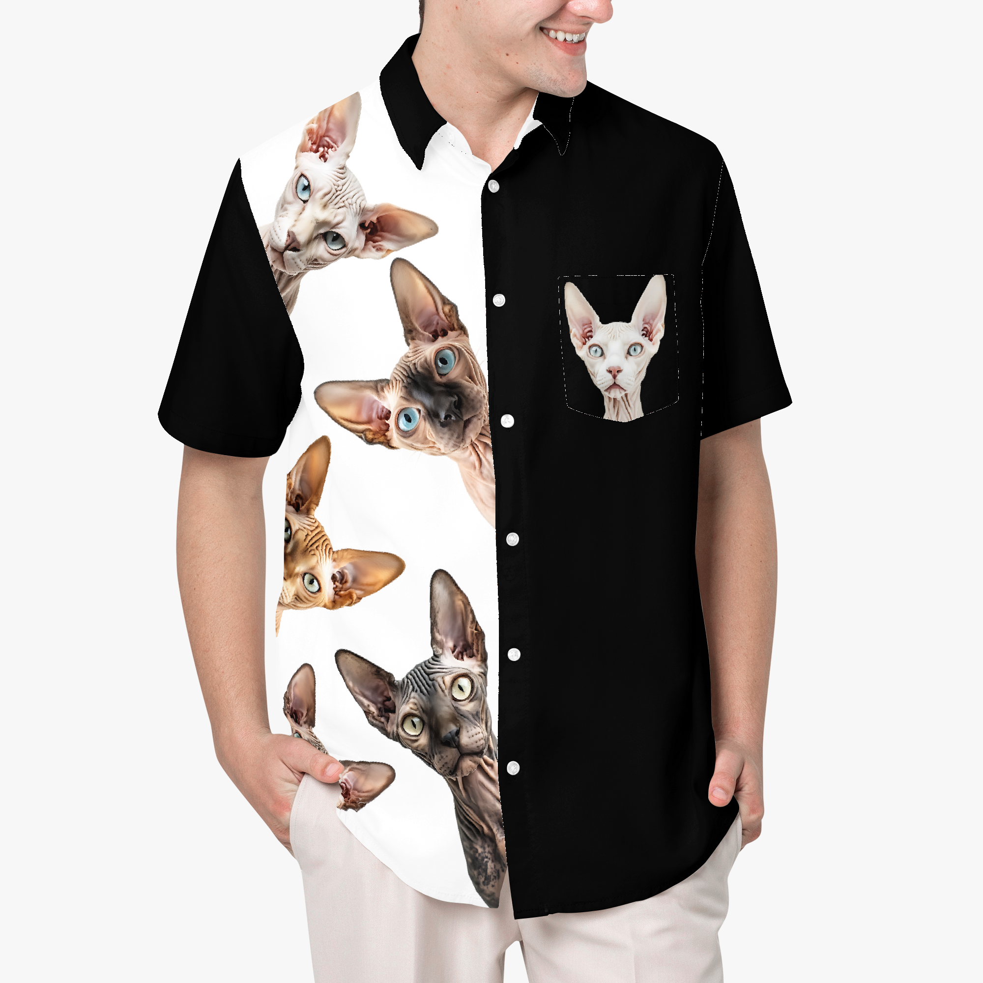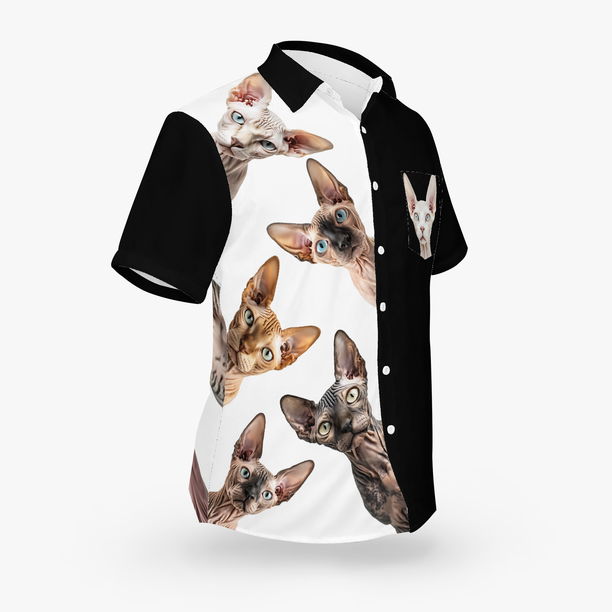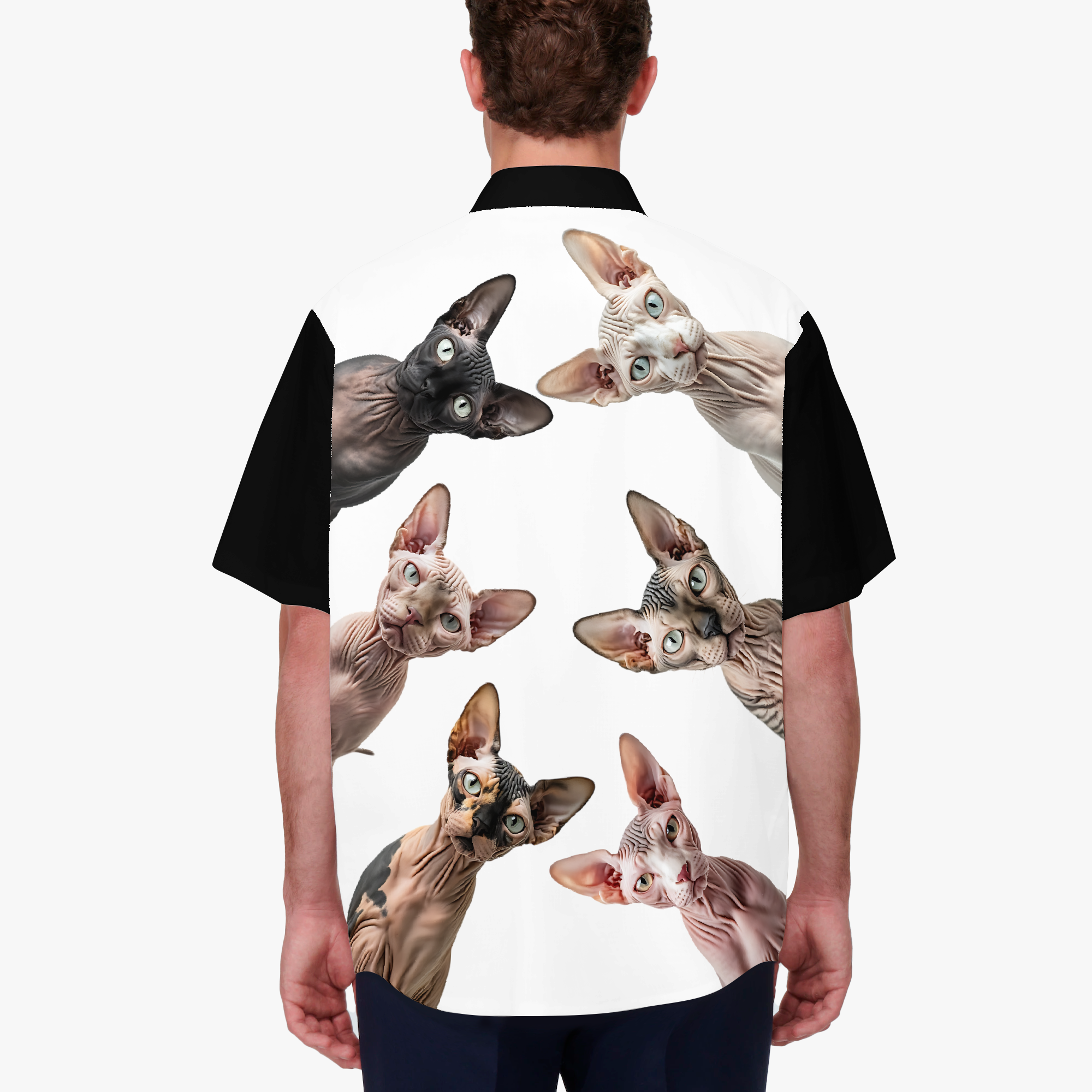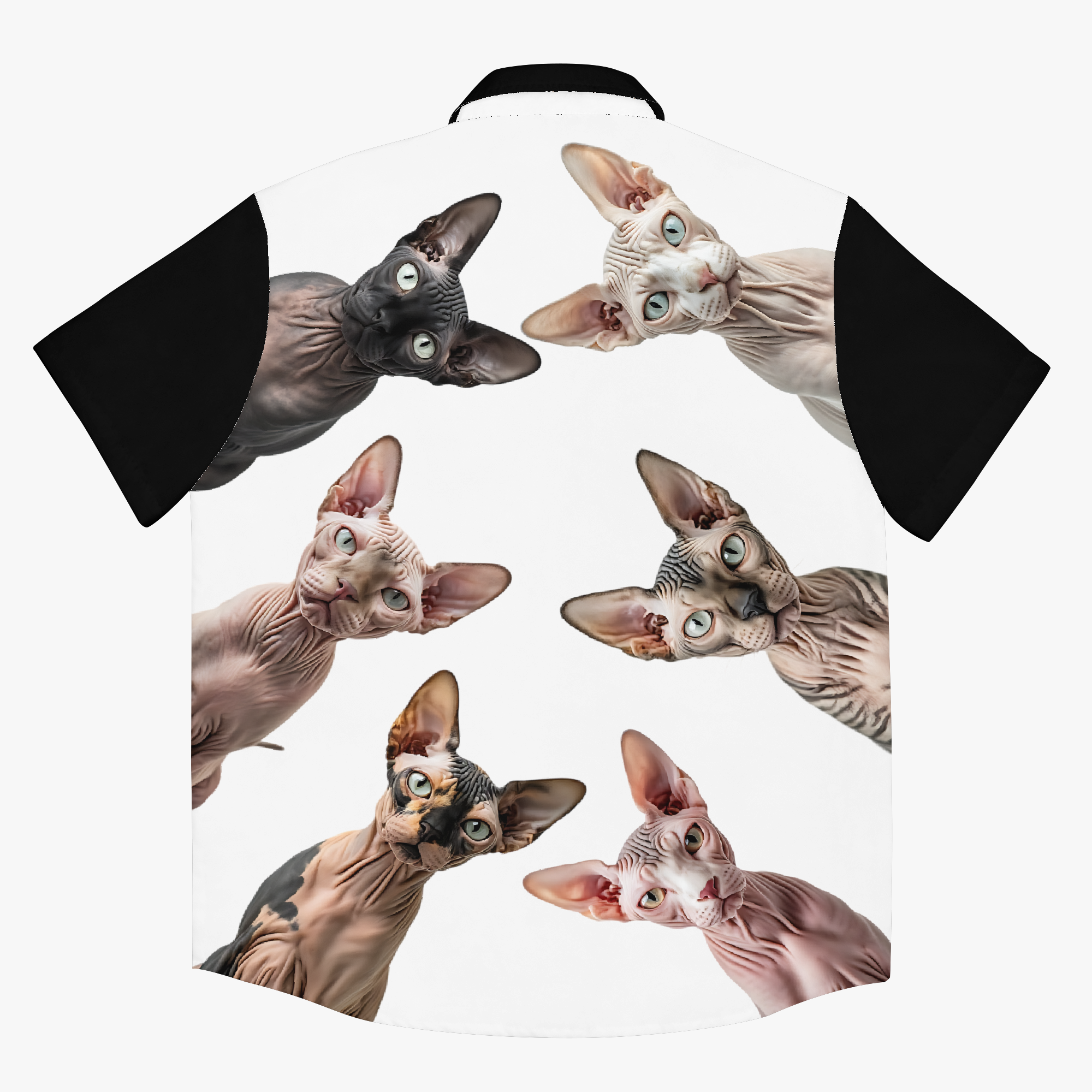 The Sphynx Collective surrounds you with a chorus of curious, bare‑faced personalities… a whole council of watchful eyes studying the world with regal mischief. This design creates a playful sense of being watched by a room full of tiny, hairless critics. It’s bold, surreal, and full of attitude. While wearing this, rest assured that it won’t just be the cats who may check you out.