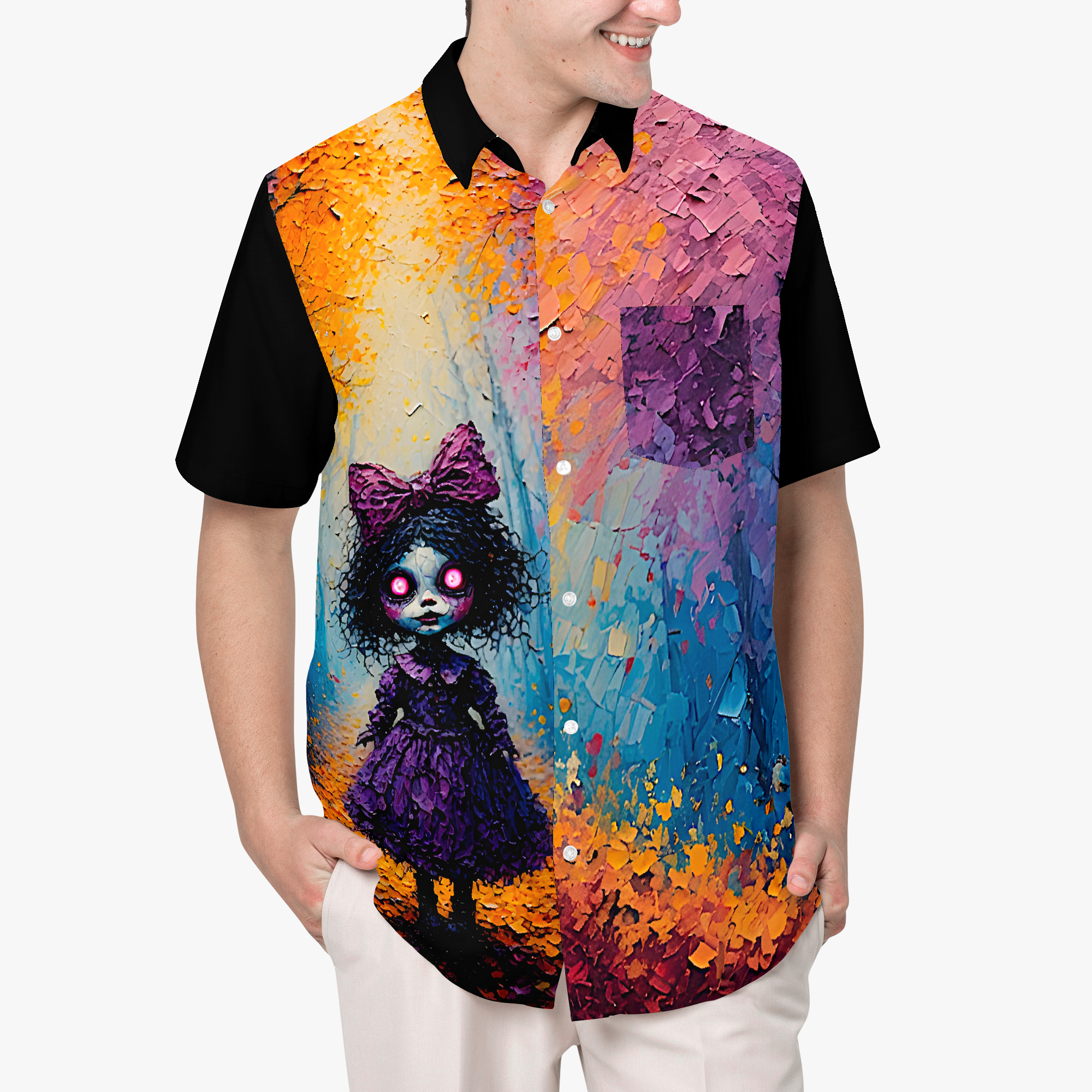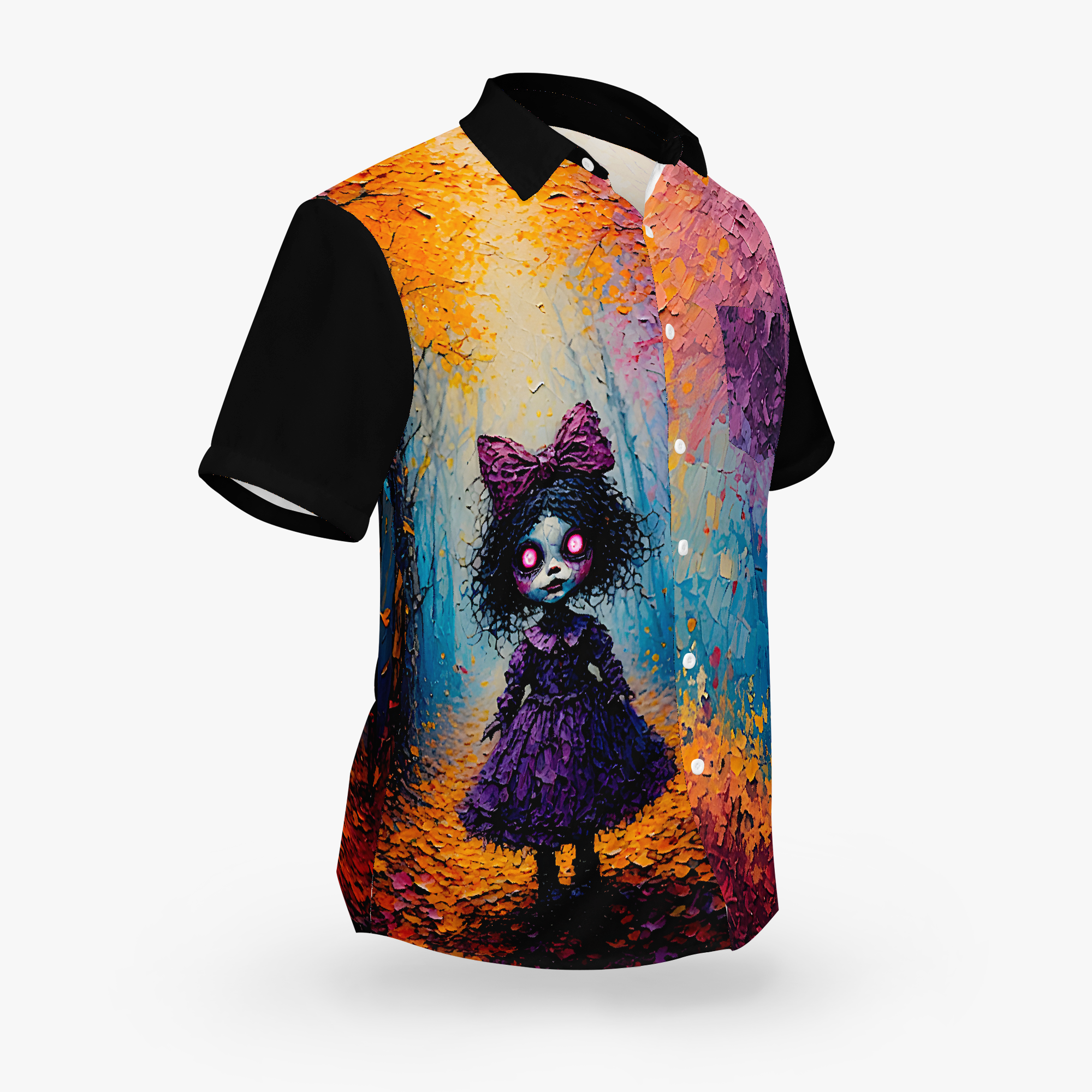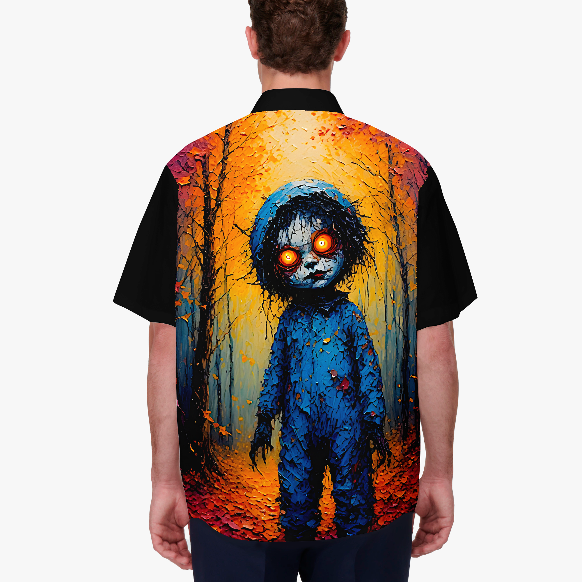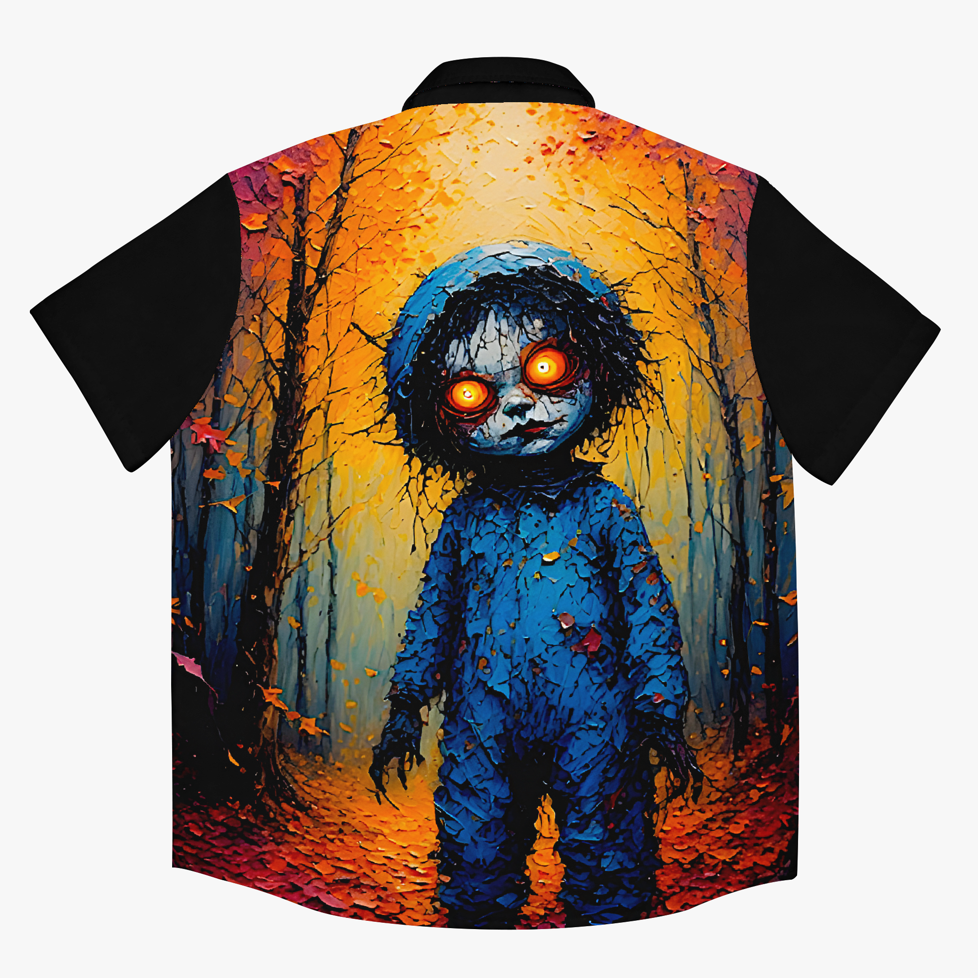 Some dolls are meant to be hugged. These ones? Maybe just admired… from a distance. This shirt pairs eerie forest vibes with vintage toy energy, glowing eyes and all. It’s equal parts cozy and creepy—like autumn took a wrong turn and ended up in a haunted antique shop.
